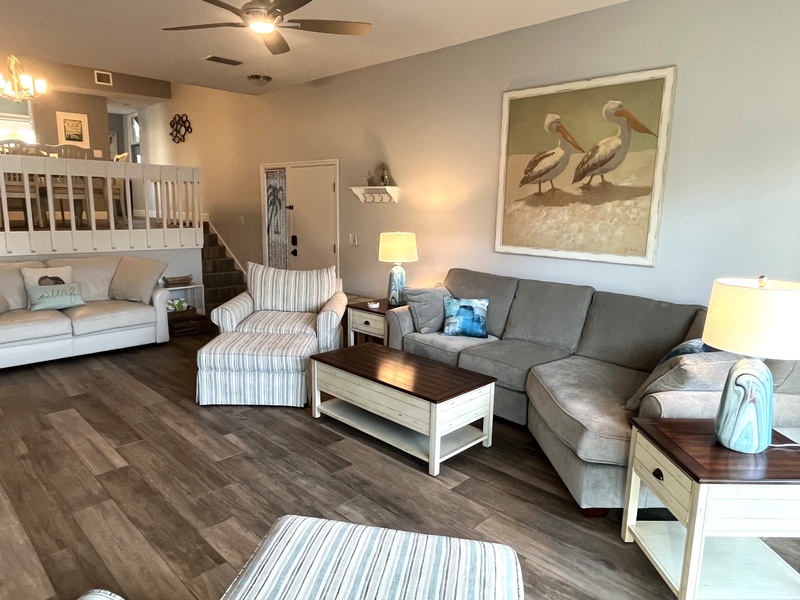 Our House at the Beach C-111 features a generous bi-level layout with separate dining and living room spaces, making it perfect for family gatherings or entertaining friends. The eat-in kitchen is fully stocked with new pots, pans, dishware, and flatware, and it includes full-sized appliances such as a dishwasher, microwave, and washer and dryer for your convenience.